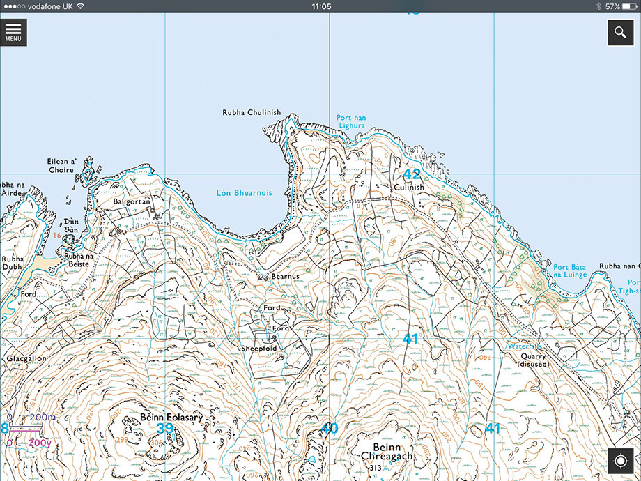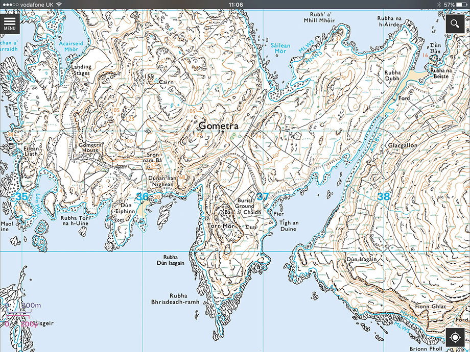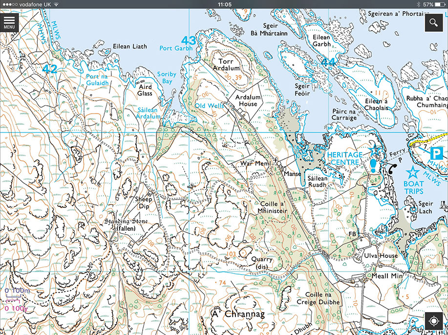 Ordnance Survey Interactive Map below. The four red marks on Ulva show where you must take turnings in the track or the location of the bridge to Gometra. The two red marks on Gometra show the location of Jane Ann's and Teacher's bothies.