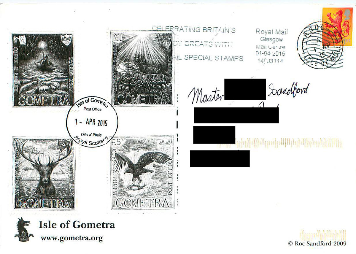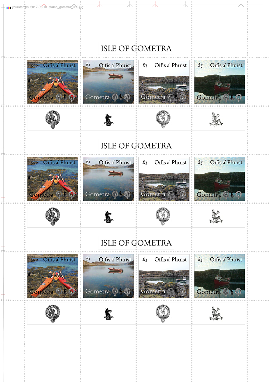 Gometra local carriage stamps were launched on 1st April 2015. They come in 50p (postcard), £1 (letter), £3 (box of messages) and £5 (half cwt) denominations, for outgoing carriage of letters, postcards, messages and freight from Gometra to Ulva Ferry, and incoming carriage of messages and freight from Ulva Ferry to Gometra. Carriage beyond Ulva Ferry requires a Royal Mail stamp. Incoming carriage of letters and postcards is provided by Royal Mail's weekly incoming service from Ulva Ferry to Gometra.