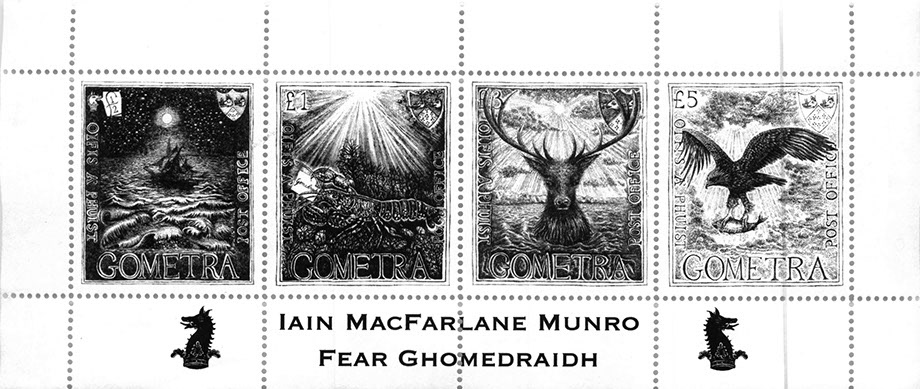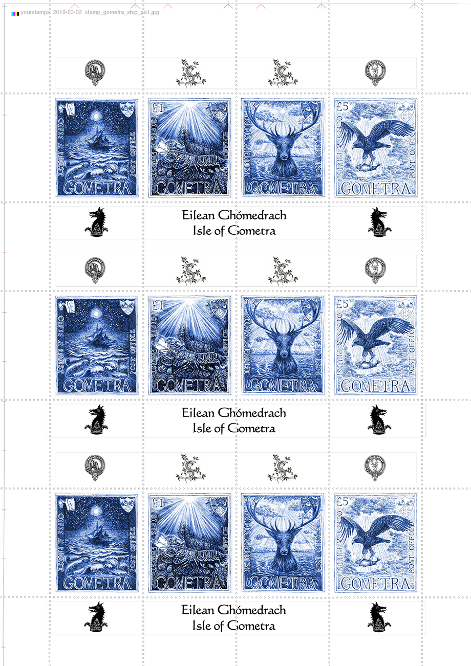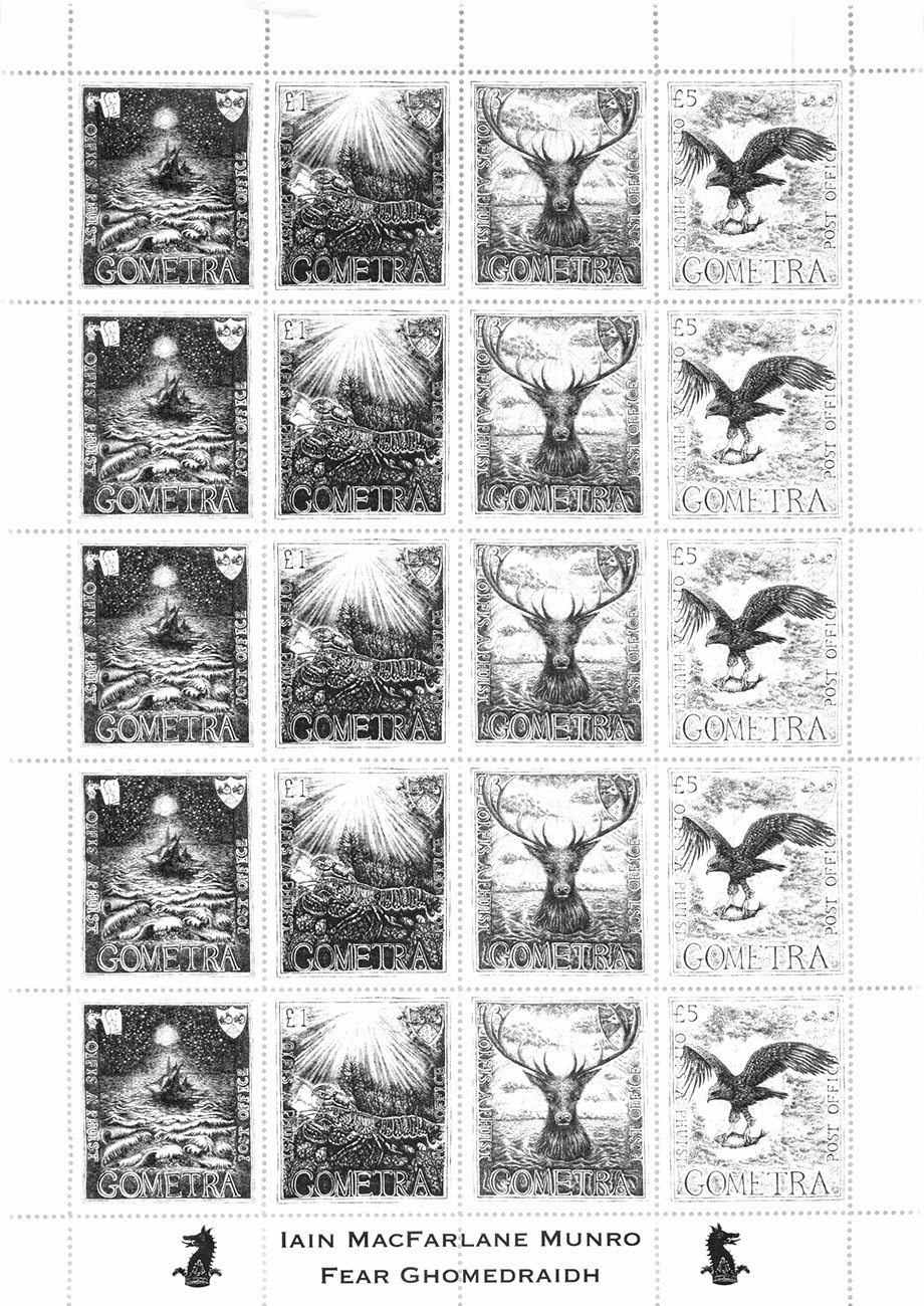 The stamps are available in first day cover form, as mini-sheets of one each of the four different stamps, or as large sheets of five copies of each of the stamps, i.e twenty different stamps in all. The designs suggest Gometra's thrilling mystery and rich wildlife. Each stamp is 4.2 cm wide and 4.85 cm high (to centre of perforations).